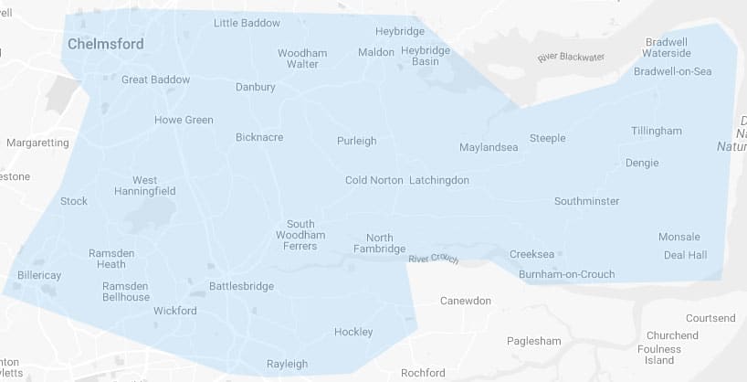 Areas covered: Maldon, Heybridge, South Woodham Ferrers, Burnham on crouch, Althorne, Bicknarce , Purleigh, Danbury, Cold Norton, , Chelmsford, Rayleigh, Runwell, Wickford, Billericay, Stock, If your area is not here please contact us.